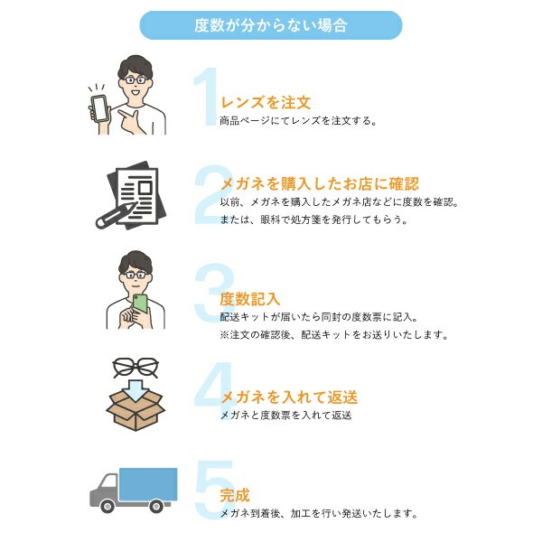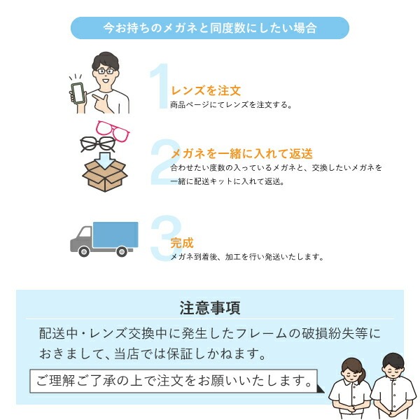 ※今お持ちのメガネの度数と合わせたい場合は、そのメガネと交換したいメガネを一緒に入れて当店までお送りください。
