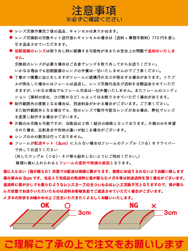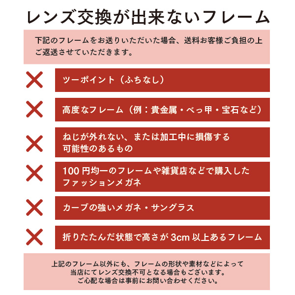 ・レンズ交換が不可のフレームをお送りいただいた場合は、送料770円(諸経費を含む)を差し引いた、商品金額を返金させていただきます。